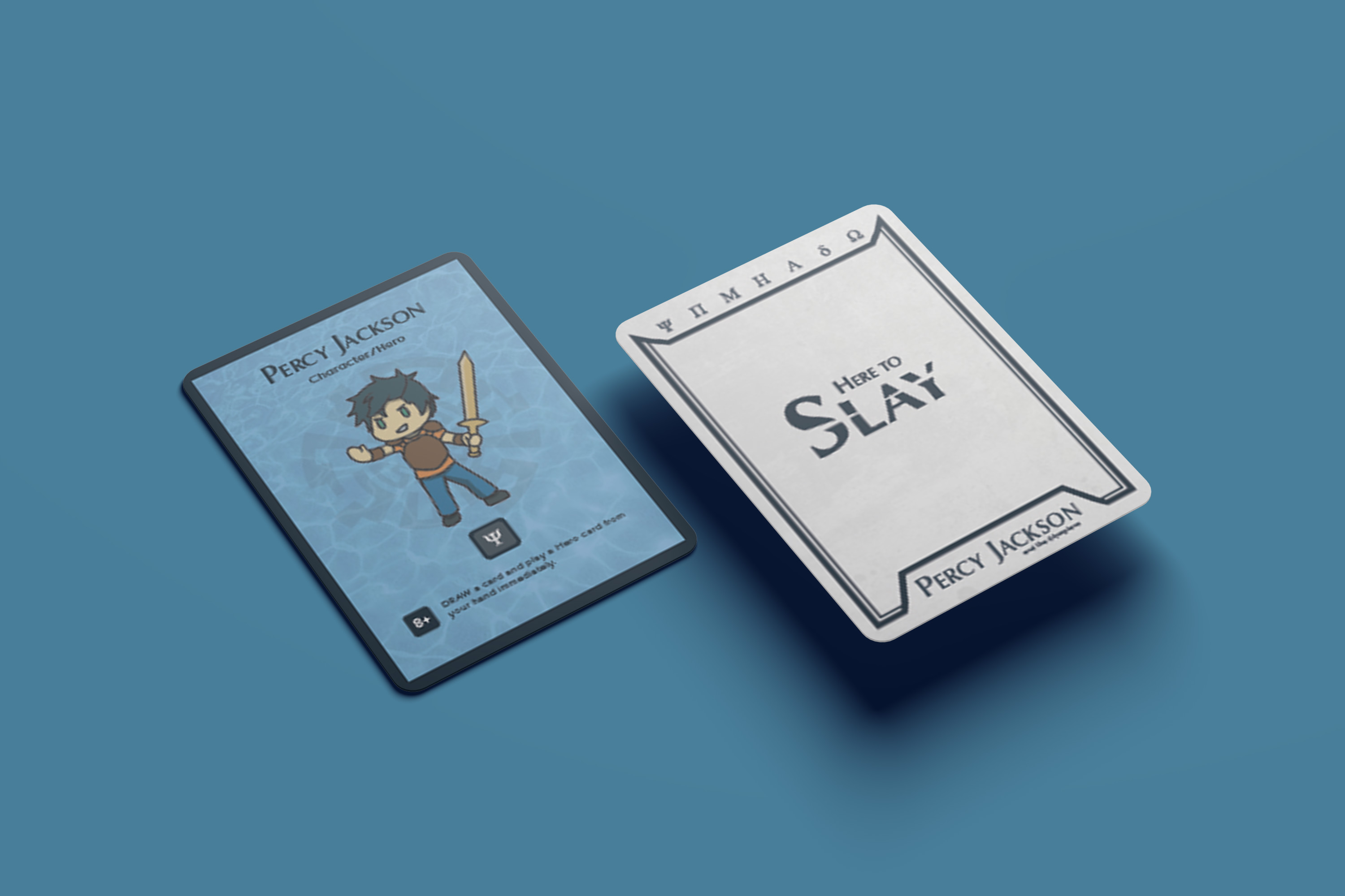 Here to Slay ft. Percy Jackson is a card game design project that combines strategy, storytelling, and immersive visuals. The goal was to bring the world of Percy Jackson to a whole new world while staying true to the characters and themes of the series. Every element, from illustration to layout to packaging, was carefully considered to create a game that is visually appealing, easy to navigate, and fun to play for both fans and new players through an interactive experience that captures the spirit of both franchises.